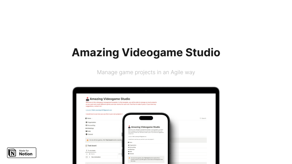 Project and GDD management for small game dev teams. Includes a cost tracker, sprints, backlogs and user stories. You will also be able to keep a record of your meetings and get things done !